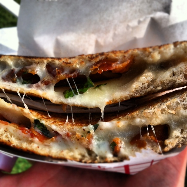Today, the line for the Grilled Cheeserie was very very long. Hungry people were waiting for over an hour! I too, waited for a long time so that I could try my second melt from the truck. Don't be discouraged. The line was long for two reasons: it is Labor Day weekend and it was parked at the first of many outdoor concerts at the Musicians Corner concert series in Centennial Park.